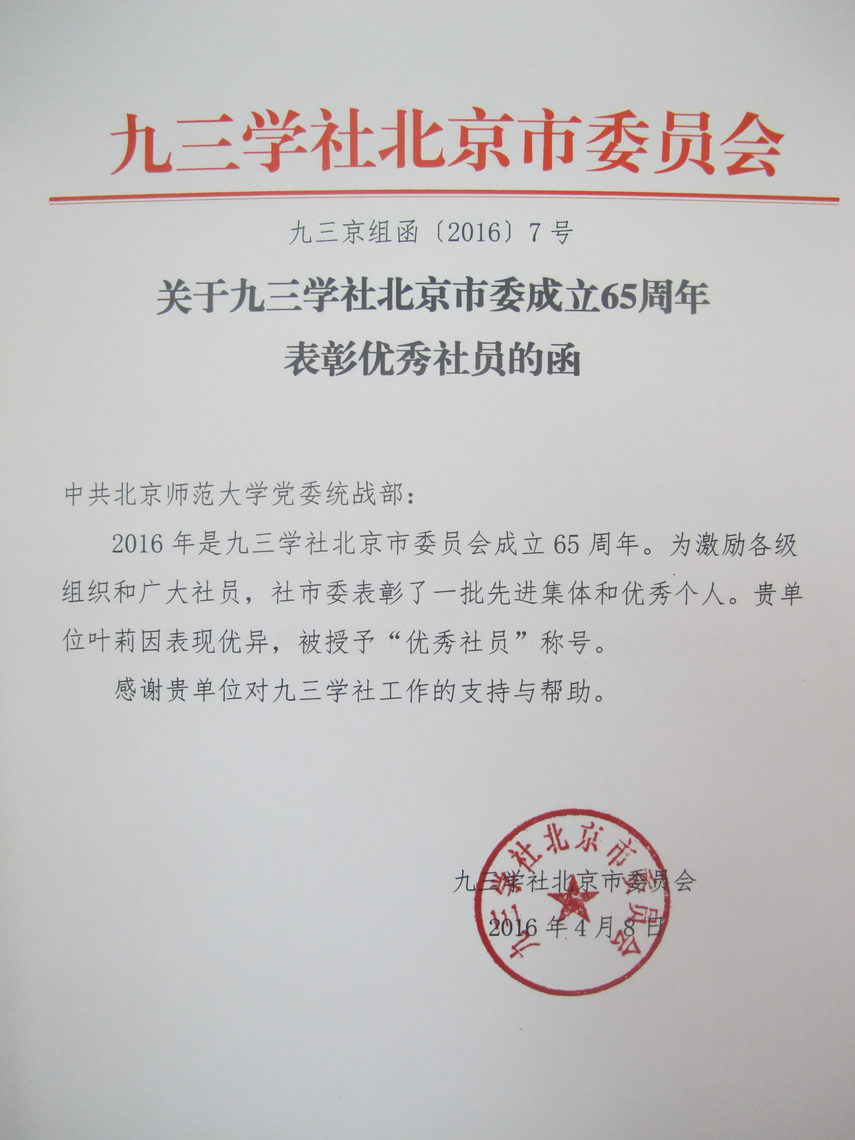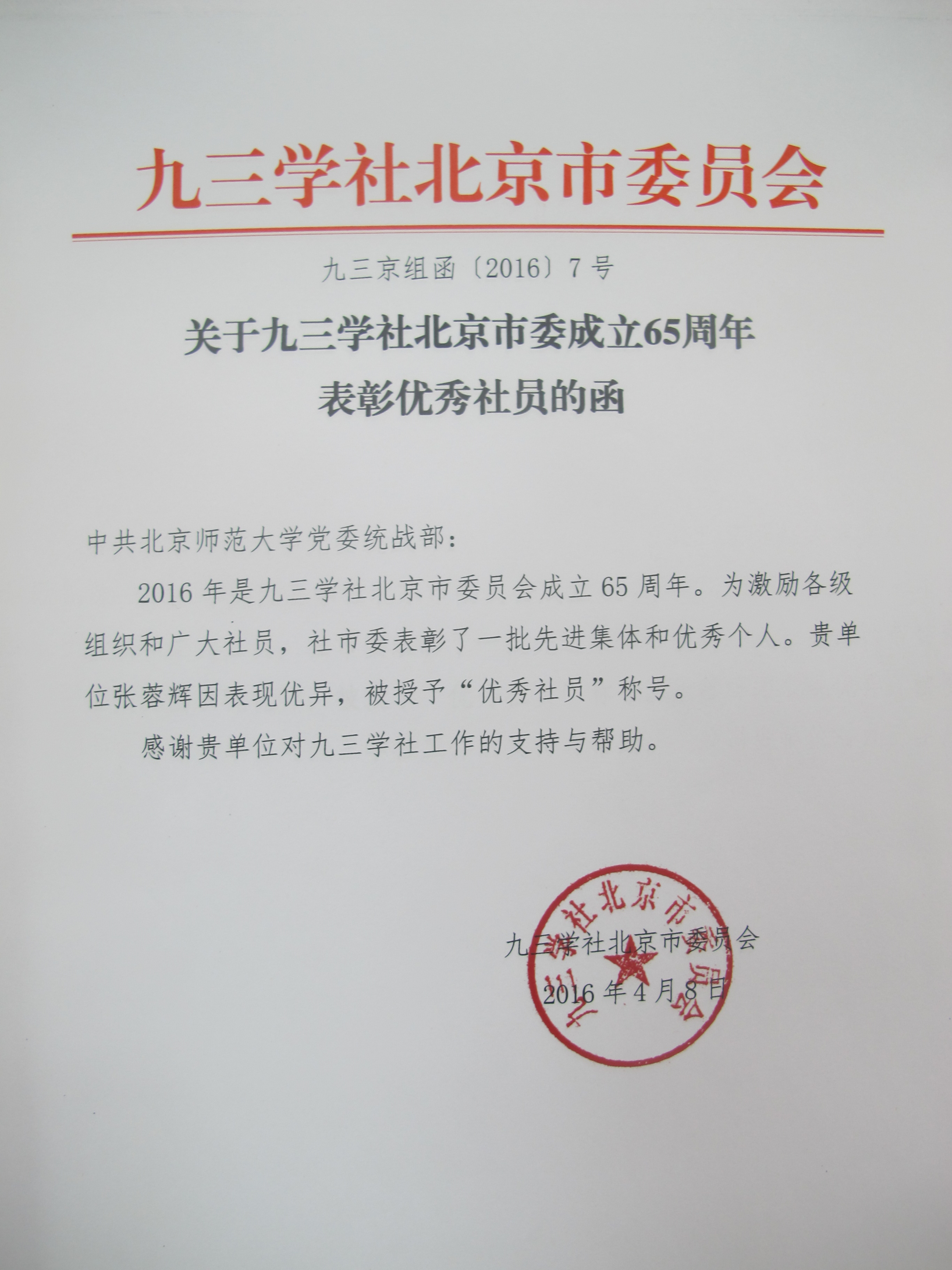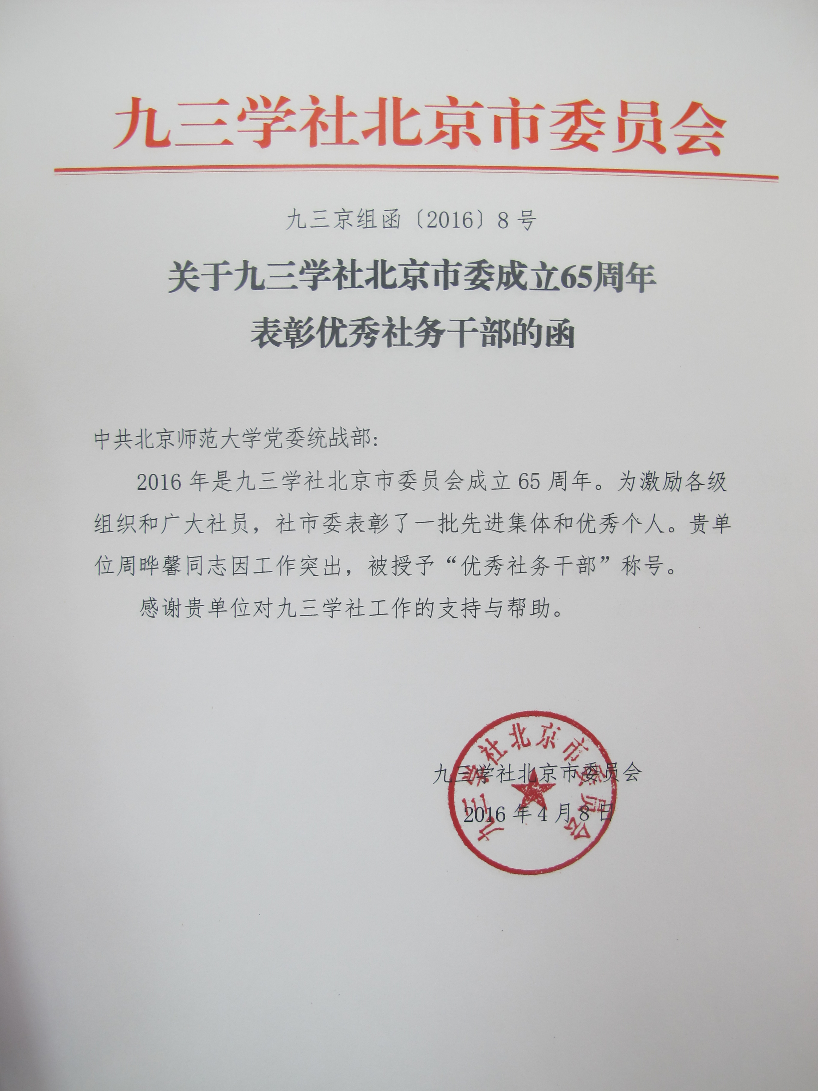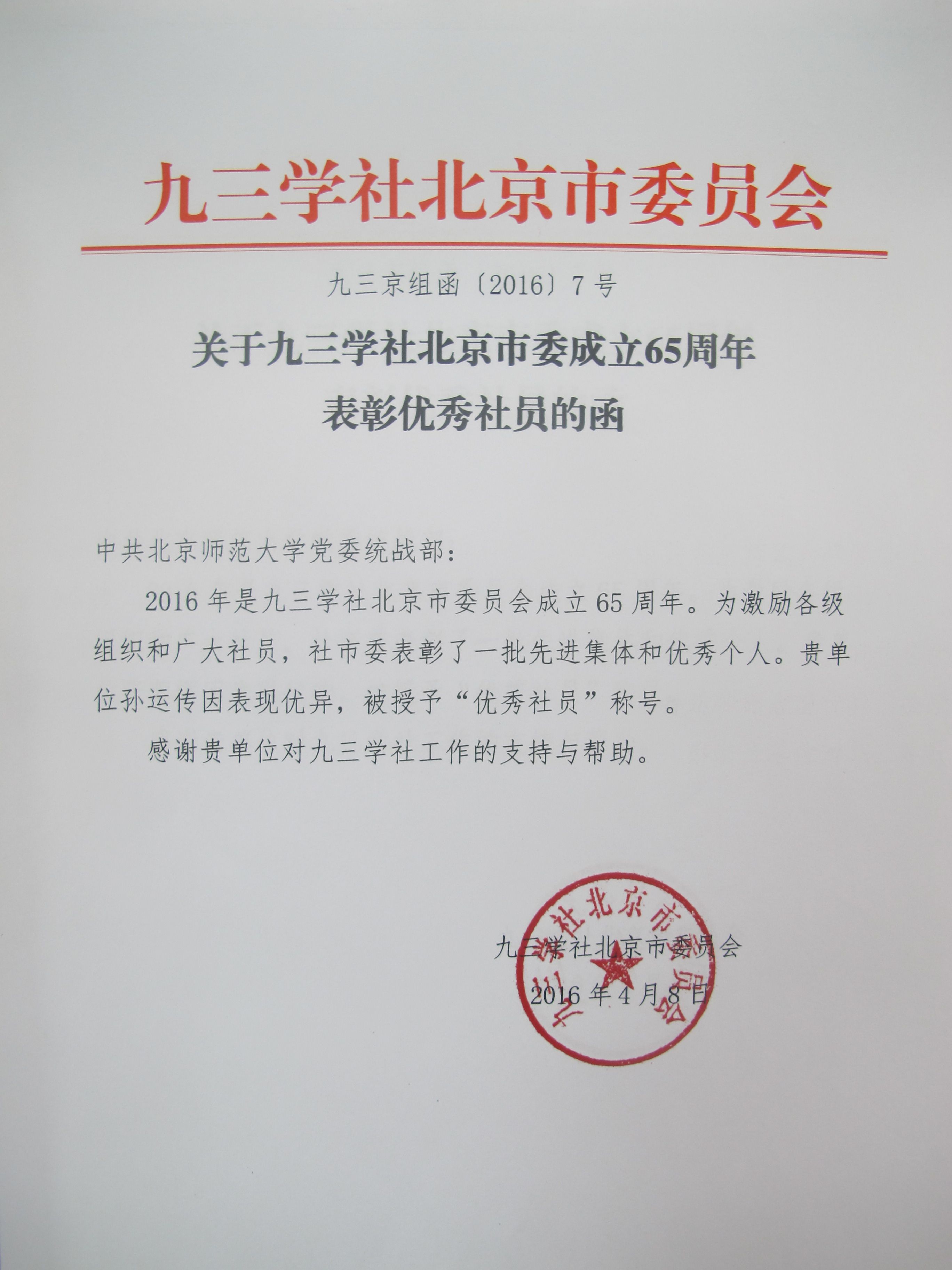 2016年是九三学社北京市委员会成立65周年。六十多年来,在九三学社中央和中共北京市委的领导下,九三学社北京市委员会坚持弘扬民主科学精神,带领广大社员围绕中心、服务大局,积极履行参政党职能,取得了较好的成绩。