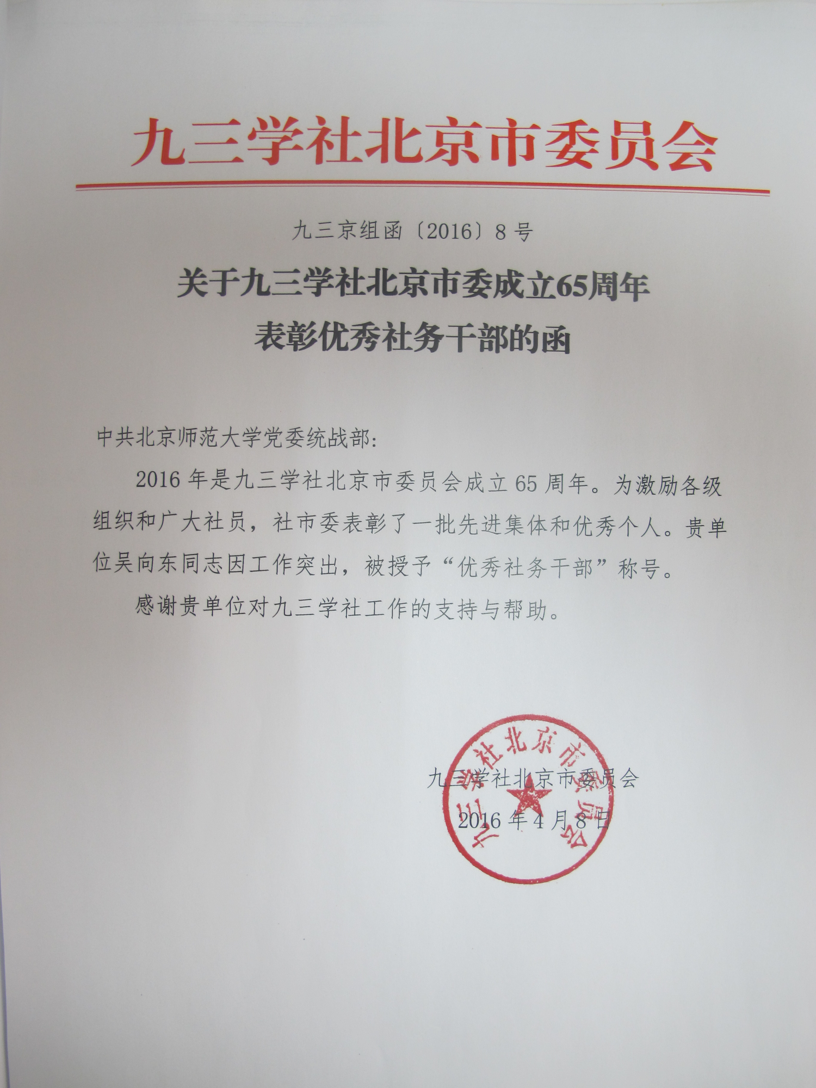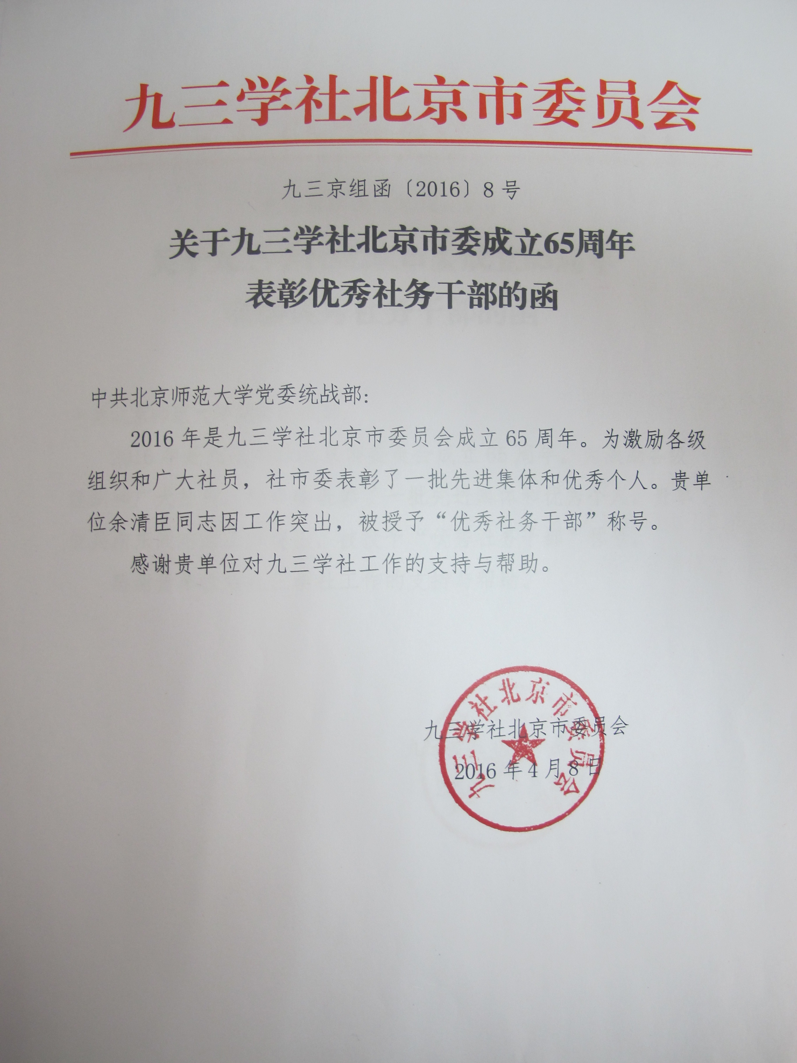 为了继承和发扬九三学社“爱国、民主、科学”的优良传统,展现社各级组织蓬勃活力,增强社组织凝聚力,激励广大社员更好地发挥作用,九三学社市委表彰了一批先进集体和优秀个人。我校九三学社委员会吴向东、王建民、余清臣、余先川、周晔馨被授予“优秀社务干部”称号;张源、孙运传、刘里远、张蓉辉、丁万见、叶莉、成枫峰被授予“优秀社员”称号。