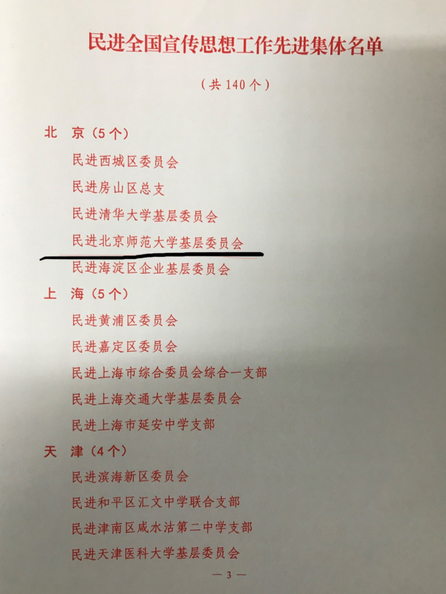 在10月10日召开的民进全国宣传思想工作会议上,民进北师大基层委员会被授予“民进全国宣传思想工作先进集体”称号。