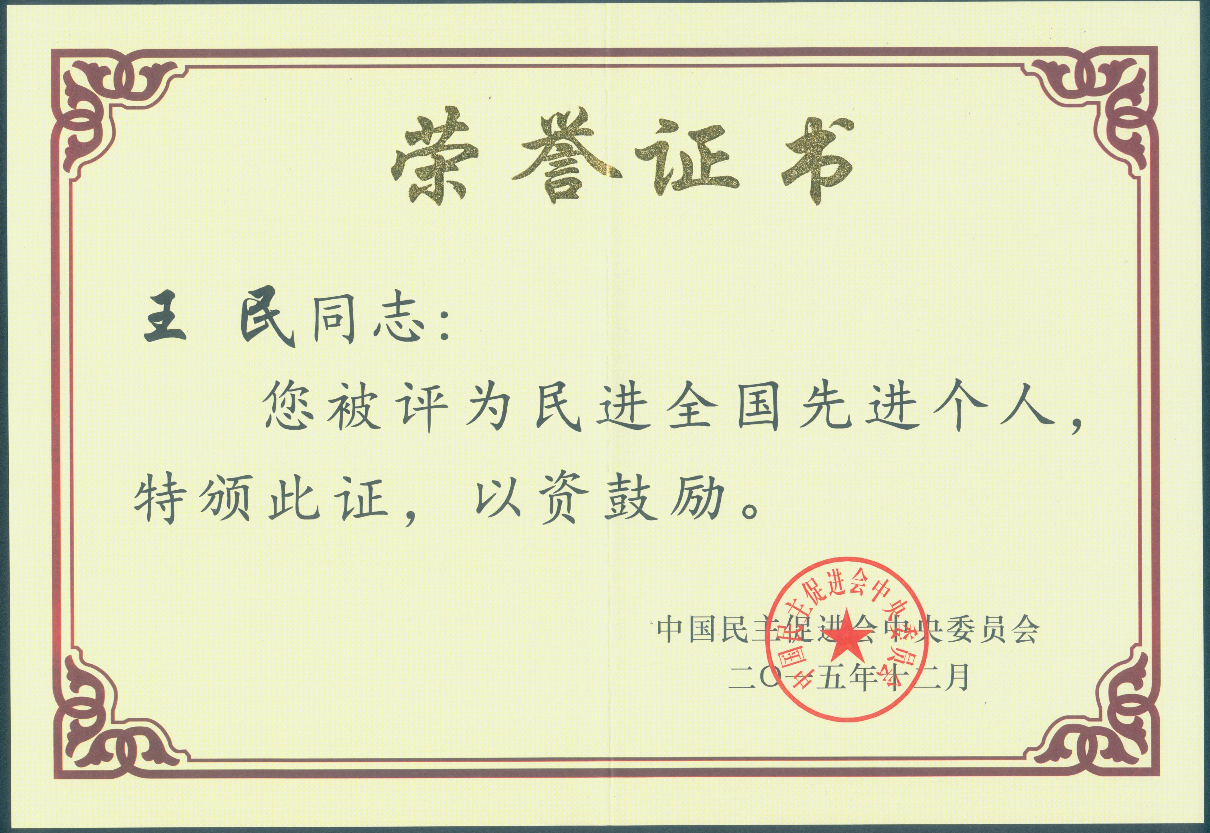 2015年12月4日,中国民主促进会成立70周年纪念大会4日在京举行,中共中央政治局委员、中央统战部部长孙春兰出席大会并代表中共中央致贺词。在纪念大会上,民进中央进行了表彰了,授予453个工作机构、市县级组织和基层组织“民进全国先进集体”荣誉称号;授予350名会员“民进全国先进个人”荣誉称号。我校王民教授荣获民进中央授予的“民进全国先进个人”荣誉称号。